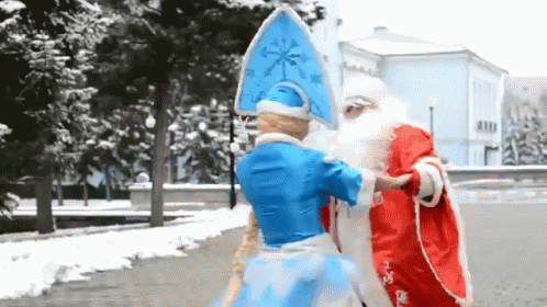 Ded Moroz and Snegurochka dancing together in a snowy outdoor setting, celebrating New Year.