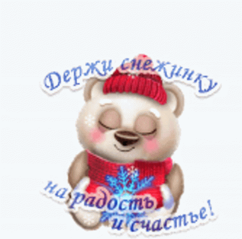 A cute animated teddy bear in winter attire holds a sparkling snowflake, with a message of joy and happiness.