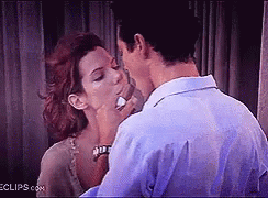 A man and woman share a Snickers chocolate bar in a playful and teasing manner, with a hint of fakeout.