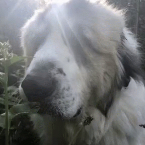 Close-up of a fluffy dog sniffing, with sunlight filtering through trees in the background.