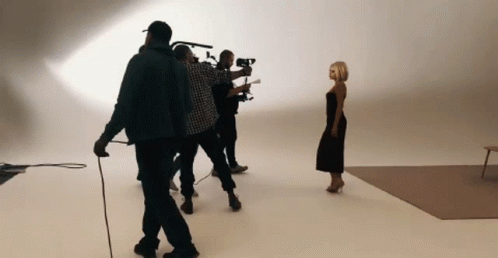 Michelle Andrade in a black dress being filmed on a music video set by a crew of men.