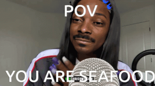 Snoop Dogg in a wig and mustache, with the text 'POV YOU ARE SEAFOOD' as a humorous meme.