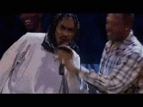 Snoop Dogg performing live on stage, holding a microphone and singing to the crowd.