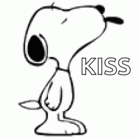 Snoopy, the beloved Peanuts character, blows a kiss with his tongue playfully sticking out, accompanied by the word 'KISS'.