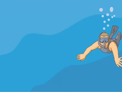 A cartoon man snorkeling underwater, exhaling bubbles as he swims in the blue ocean.