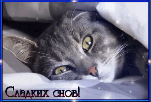 A cozy grey tabby cat with green eyes rests under a blanket, accompanied by the message 'Sweet dreams!'