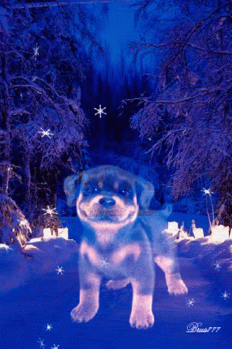 A cute puppy stands in a magical, blue-toned winter forest with falling snowflakes.