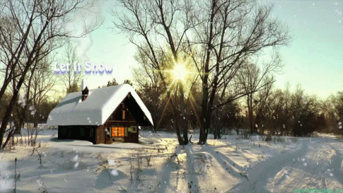 Cozy snow-covered cabin in a serene winter landscape with falling snow and bright sunshine, featuring 'Let It Snow' text.