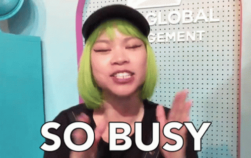 Goldie Chan, with vibrant green hair, expresses being 'SO BUSY' in front of a 'Global Management' sign.