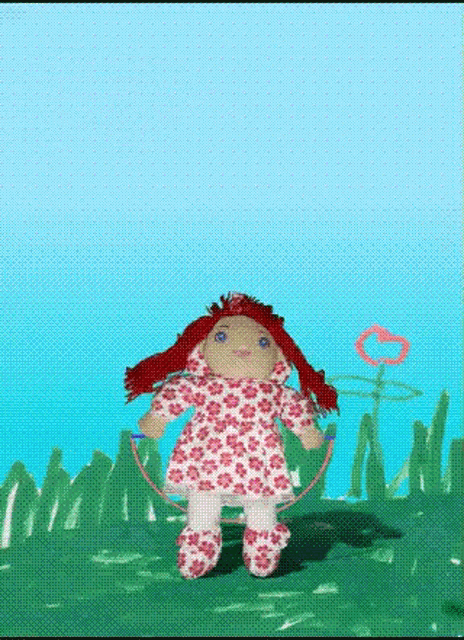 Red-haired doll in a floral dress holds a jump rope, with 'Só Falta 1 Dia' text appearing on screen.