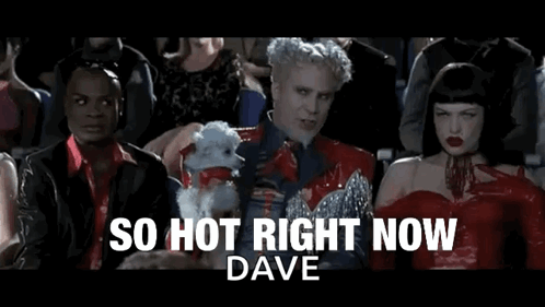 Mugatu from Zoolander declares 'So Hot Right Now Dave' while holding a small dog in this memorable meme scene.