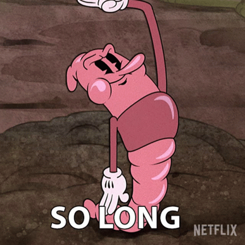 A cheerful pink earthworm from The Cuphead Show stretches, with 'SO LONG' displayed below.