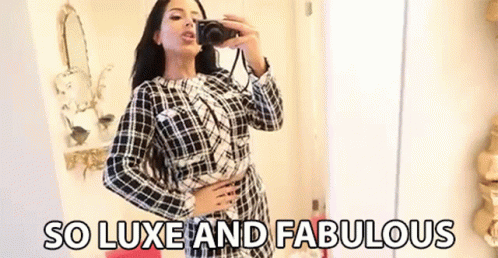 Amber Scholl poses confidently in a black and white plaid outfit, taking a 'So Luxe And Fabulous' mirror selfie.