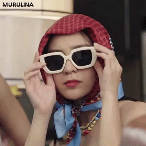 Woman in white sunglasses and a red headscarf, looking over her glasses with a curious expression.