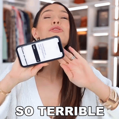 Shea Whitney holds a phone to her face, reacting with the phrase 'So Terrible'.