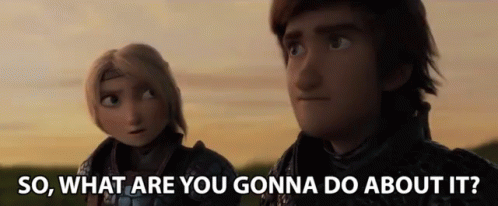 Hiccup Horrendous Haddock and Astrid Hofferson from How To Train Your Dragon looking at each other with a challenging question.