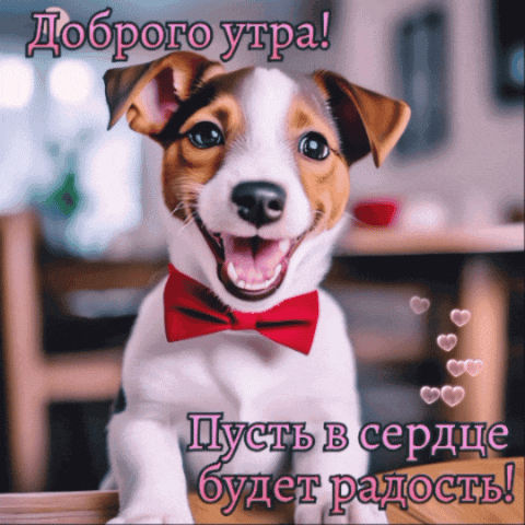 A cute puppy wearing a red bow tie wishes 'Good morning!' with a message of joy.