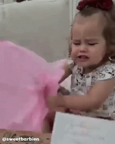 Sofiakalimann Sosokalimann, a baby, cries while struggling to unwrap a pink gift, showing frustration.