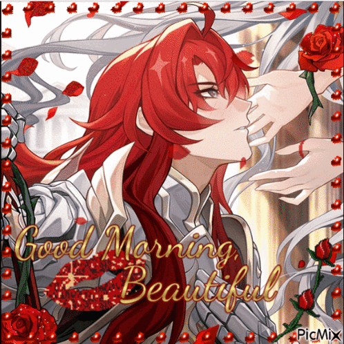 Argenti from Honkai Star Rail in armor, with long red hair, accompanied by 'Good Morning Beautiful' text and roses.