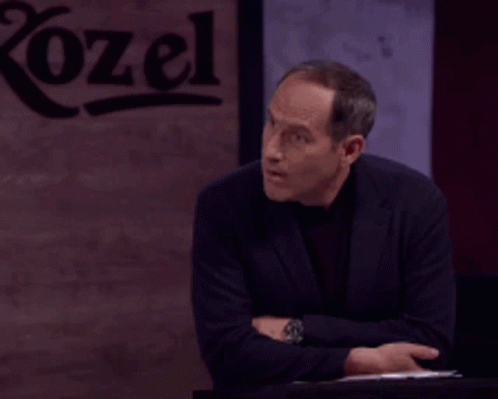Man in a suit gestures in agreement in front of a 'Kozel' sign, expressing his assent.