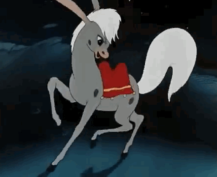 The Humpbacked Horse from Soyuzmultfilm, a cartoon horse, prances with a red saddle.