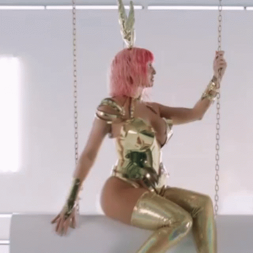Sojke 123456 in a golden Playboy Bunny outfit with pink hair, posing on a swing.