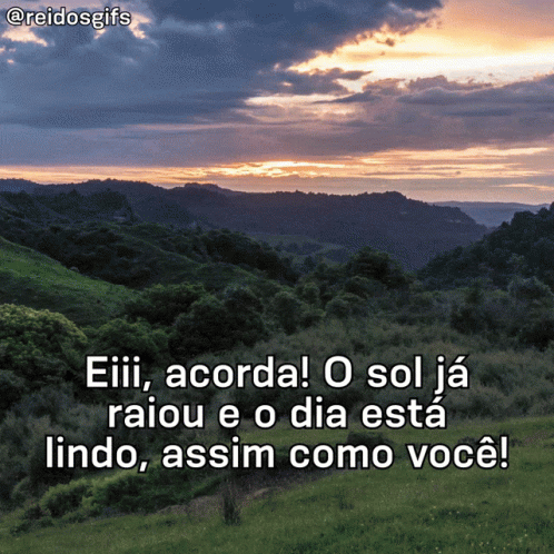A beautiful sunrise over mountains with a Portuguese message: 'Hey, wake up! The sun has risen and the day is beautiful, just like you!'