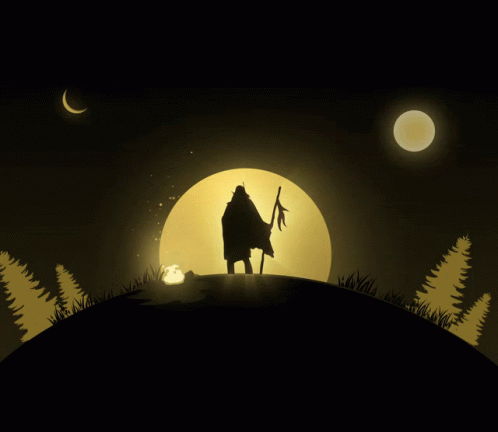 A silhouette of a shaman-like figure with a staff stands on a hill against a glowing full moon, embodying ancient wisdom.