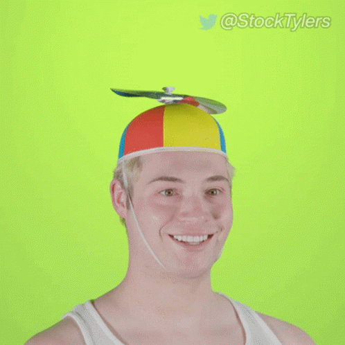 Tyler, wearing a colorful propeller hat, smiles and says "I love you" against a bright green background.