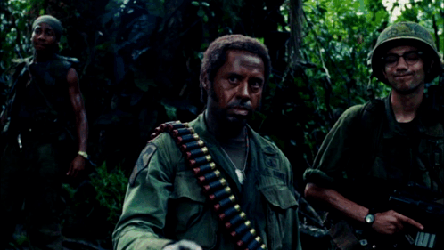 A scene from Tropic Thunder where a soldier points and asks 'What did you call me!?' in a jungle setting.