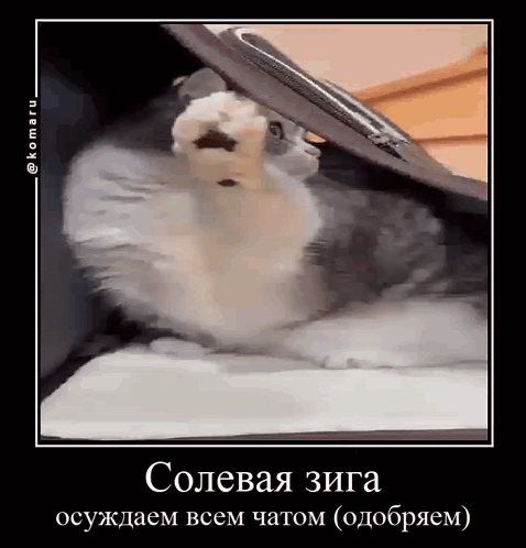 Komaru Cat performs a humorous 'salt zig' gesture, ironically condemned and approved by the chat.