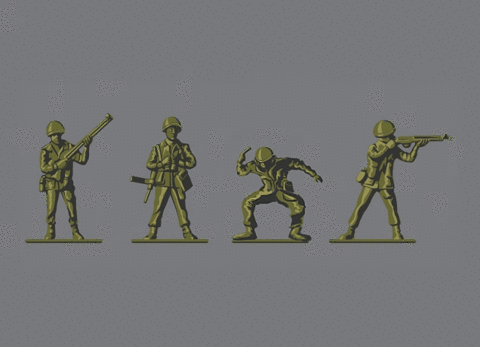 Four green plastic toy soldiers are displayed in various poses against a gray background, showcasing classic army men figures.