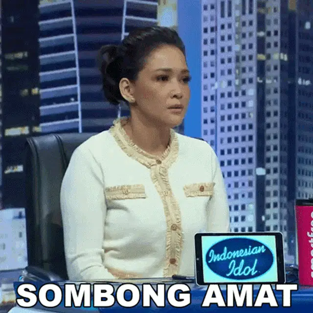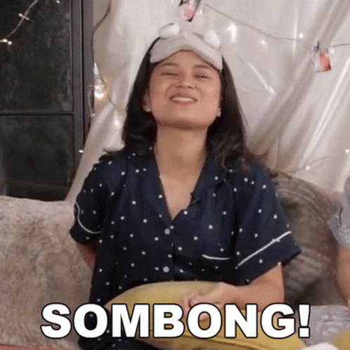 Rusnia, wearing a sleep mask and pajamas, playfully says 'Sombong!' while sitting on a couch.