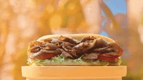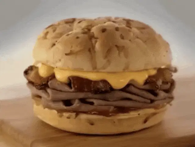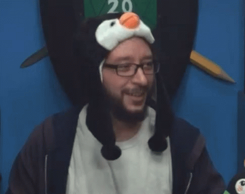 Rick Budd in a penguin hat, talking about 'something about Arby's sauce'.