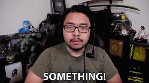 YongYea, wearing glasses and headphones, emphatically says 'SOMETHING!' to the camera from his gaming setup.
