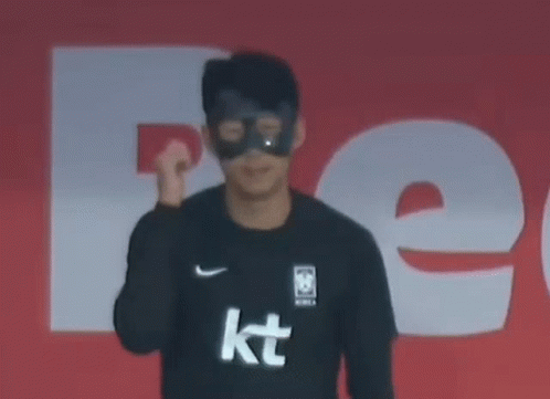 Son Heung Min, also known as Sonny, makes a playful gesture while wearing a black face mask and a black shirt.