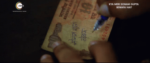 A person writes 'Sonam Gupta Bewafa Hai' on an Indian 10 rupee note, referencing the viral phrase.