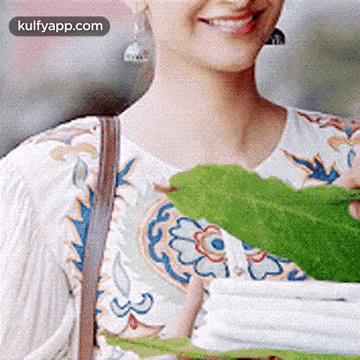 Sonam Kapoor smiles brightly, holding a green leaf, wearing a white embroidered top and jhumka earrings.