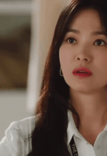 Song Hye Kyo smiles happily, wearing a white shirt and a lanyard. Her long dark hair frames her face.