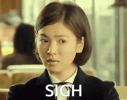 Song Hye Kyo in a school uniform expresses disappointment with a visible 'SIGH' overlay, reflecting a relatable moment.