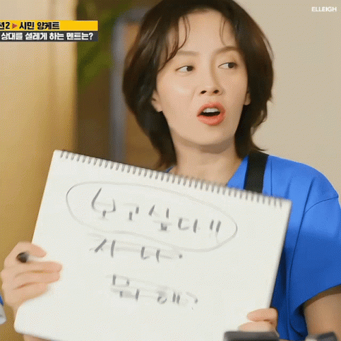 Song Jihyo holds a whiteboard with 'I miss you' and 'What are you doing?' written on it, looking thoughtful.