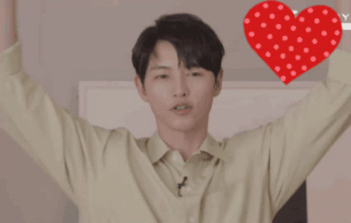South Korean actor Song Joong Ki makes a big heart gesture with his hands, showing love to his fans.