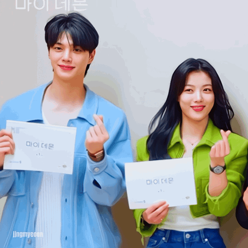 Song Kang and Kim Yoo-jung pose with 'My Demon' scripts, making finger hearts for fans.