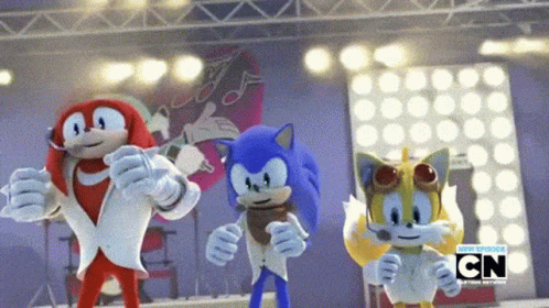 Sonic, Knuckles, and Tails from Sonic Boom dance on stage with a Cartoon Network logo in the background.