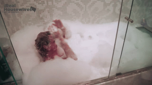 Sonja Morgan of Real Housewives of New York takes a luxurious bubble bath, with only parts of her visible through the foam.