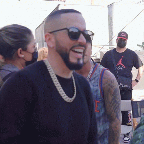 Yandel laughing and smiling, wearing sunglasses and a prominent gold chain.