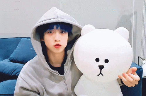 Soobin in a grey hoodie, holding a white Line Friends bear and talking, possibly during a VLive.