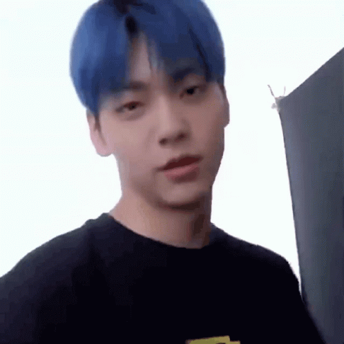 Soobin with blue hair makes a playful face, wearing a black shirt with a yellow smiley.