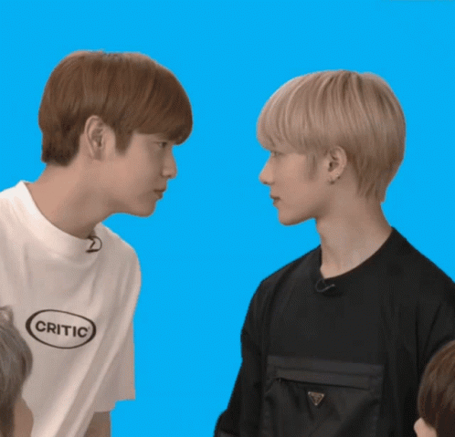 TXT members Choi Soobin and Choi Beomgyu (Soogyu) engage in a close face-off challenge.