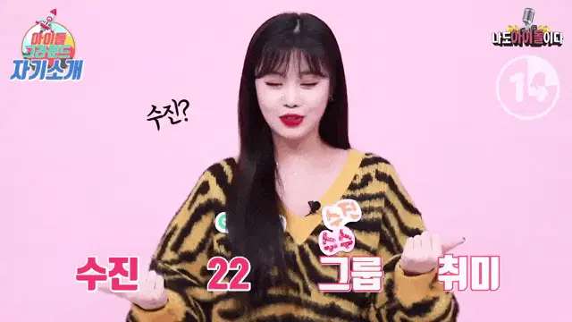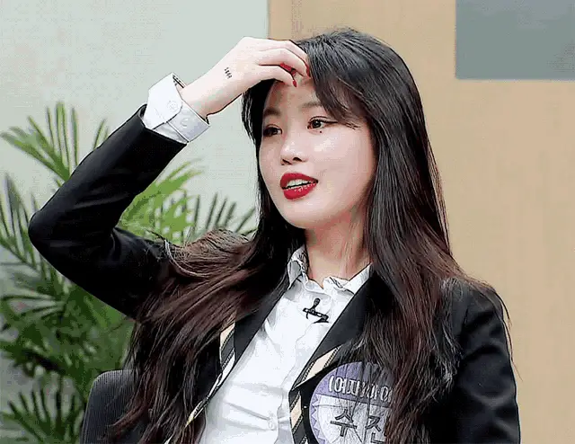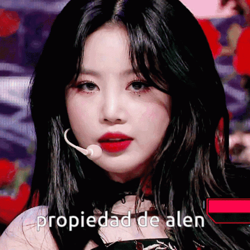 Soojin from Gidle in a captivating close-up, wearing red lipstick and a headset, on stage.